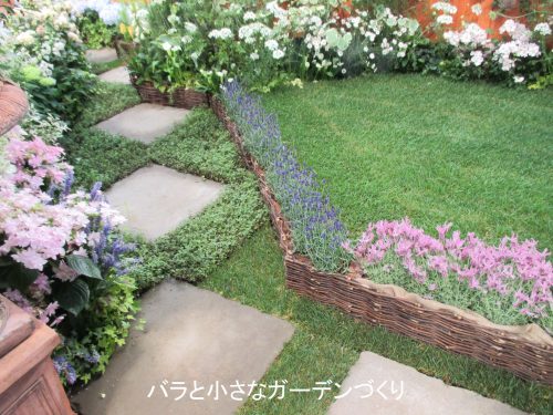 踏み石の左側に咲かせたピンクと青紫のアジサイと色を合わせた、右側のピンクと青紫の2色のラベンダーも、すごくおしゃれですね! このテクニック、すぐに自宅の庭に生かせそうです!