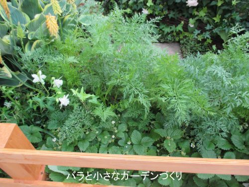 ボーダー花壇には、野菜も植えられています。上の写真の細かい葉は人参と思われます。手前にある3枚の葉を広げているのは苺ですね。左側の白い花はちょっと分かりませんが、ジャガイモの花によく似ています。