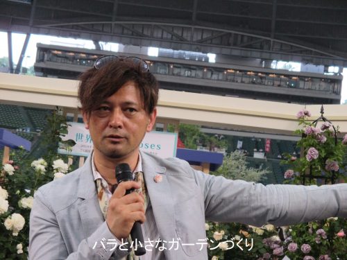 セントラル・ローズパーク内にあるイベントスペースでは大野耕生さんのトークショウ。河本バラ園のバラを中心に、おすすめの新しいバラ8品種を教えてもらいました。