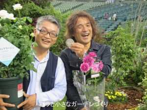 それぞれご自身が作出したバラ「シェエラザード」(右:木村卓功さん)、「アッサンブラージュ」(左:小山内健さん)をもって、記念撮影にも気軽に応じてらっしゃいました。木村卓功さん、いい笑顔ですね^^