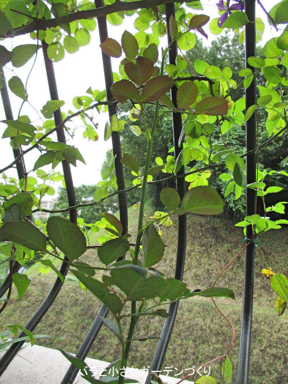 真ん中に立っているのが実験中のモンタギュー。ずいぶん背が伸びたでしょ? 1番花から咲かせた枝は25cmくらいしかないけれど、この枝はなんと60cmまで育っているの! このまま長く育てて、つるバラにしてしまおうという実験なんですよね。さてさて、どうなりますか!
