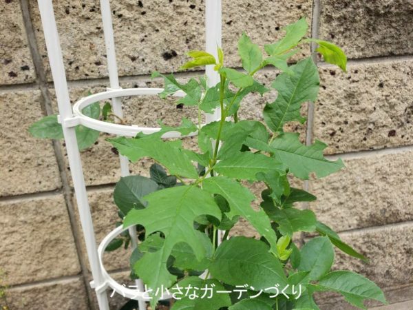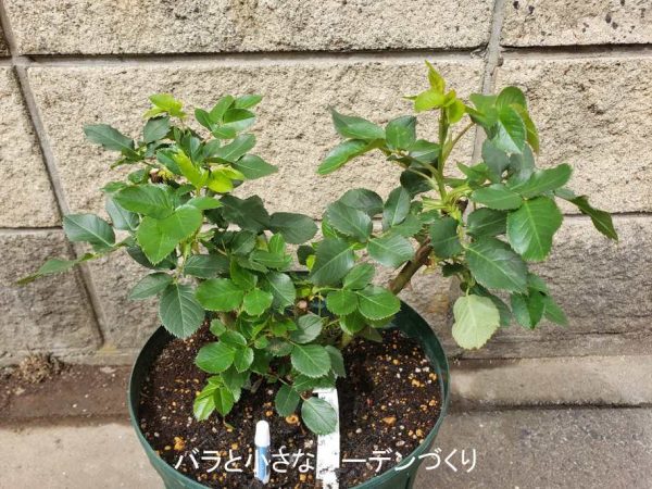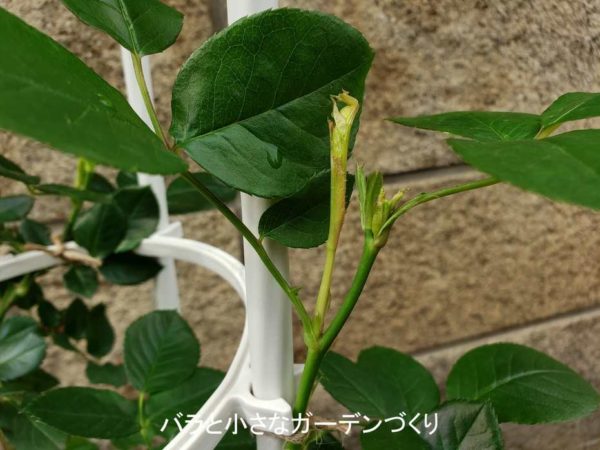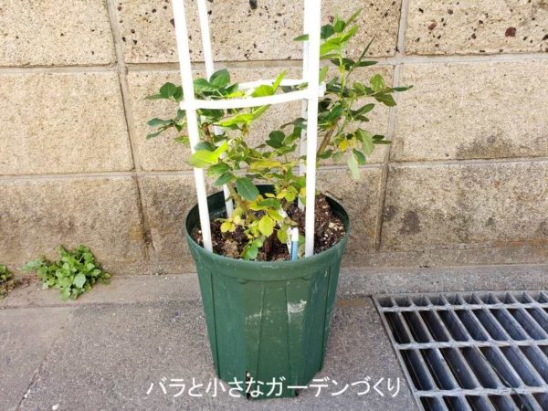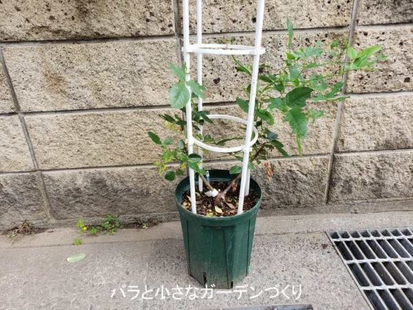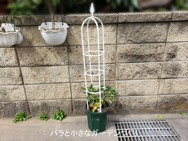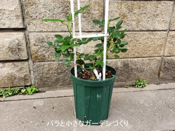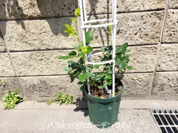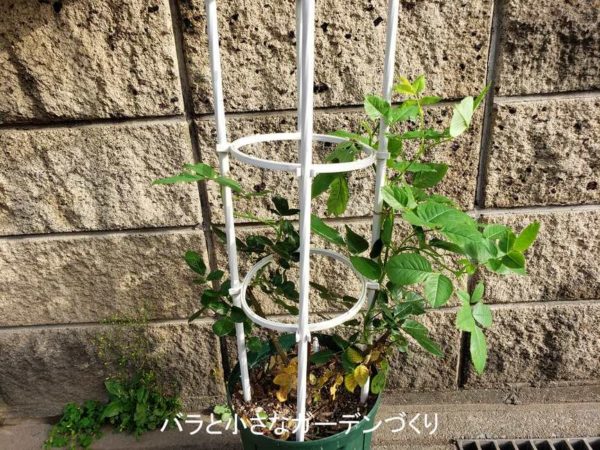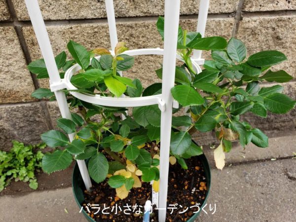 昨年失敗する前の生育の状態から枝が伸びるのが早いとわかっているので、今回はオベリスクで、小型のつるばらとして育ててみようと思いま