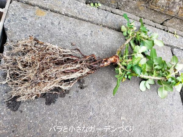 かなり若葉が広がっているのでやろうか迷いましたが、今年の冬に購入した苗に根頭がん腫病が多かったので気になって根を洗ってみました。結果、根に異常はなく、白根もよく発達した健康な大苗でホッとしました。