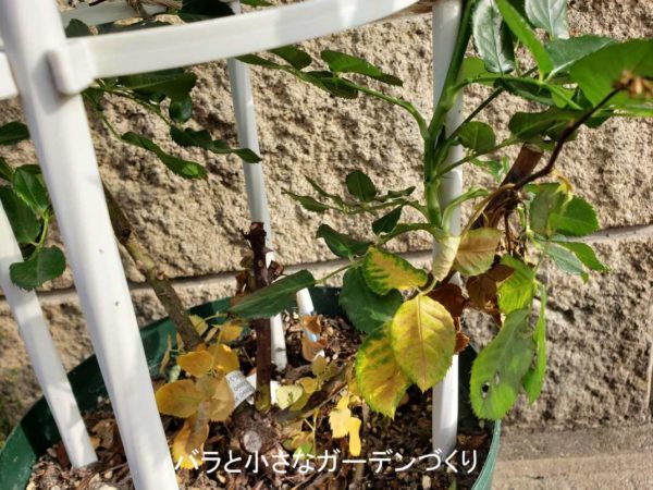 小山内健さんの本「バラづくりの疑問に答える!ローズレッスン12ヵ月Q&A」に、鉢の置き場所を少しだけ動かすといいという対策が載っていたので、30cmほど移動してみました。これで解決すればいいのですが。