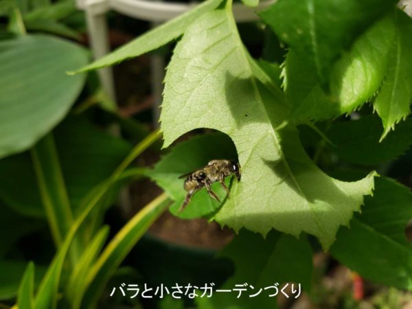 警戒心が強いらしく、しばらく粘って犯行現場を激写しました! 体長1.5~2cmほどの、一見、アブのような蜂です。バラの葉を持ち帰り、巣の材料にするそうです。