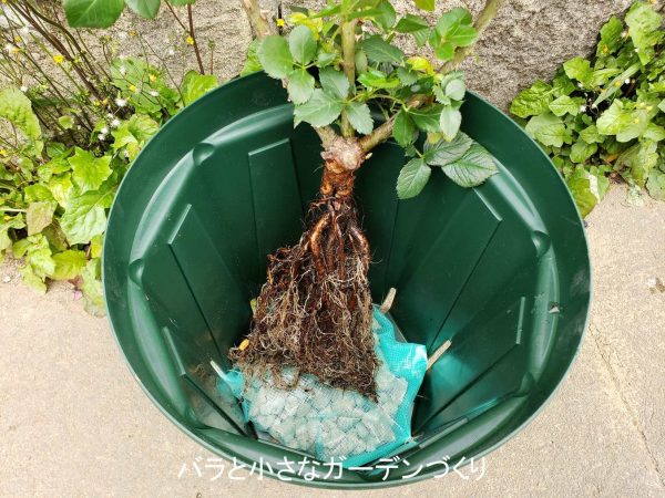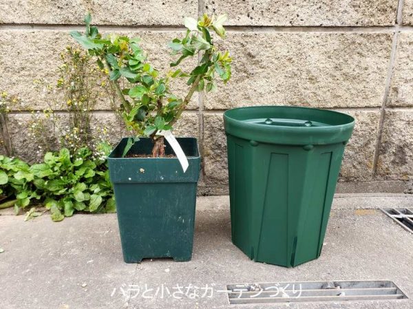 ▲「バラの家」の大苗を8号鉢に植替え 写真提供/天女の舞子