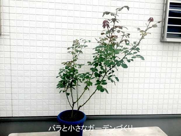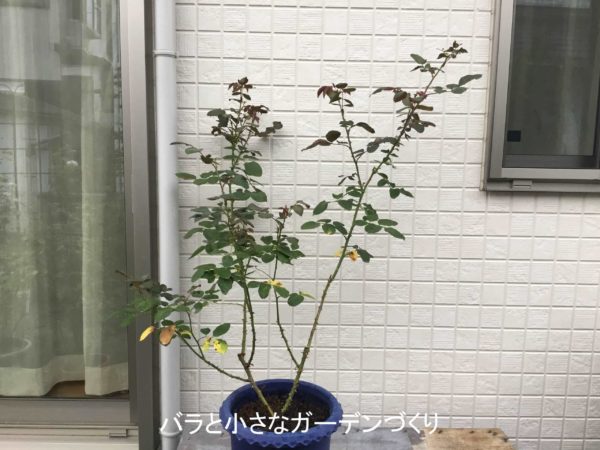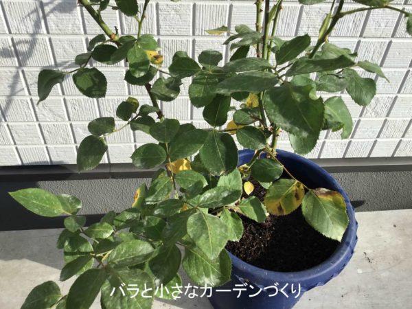 黒星病はひと段落しました。下葉がないのは、病気というより、品種の特徴だと思います。写真から、下葉が黄色いのがわかると思いますが、親株も同様で、くたびれたら枯れるみたいです。蕾は、見つけ次第ピンチしています。