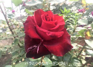 「ベルサイユのばら」は、ビロードを帯びた真紅の大輪花。花径は13~14cmに達する剣弁高芯咲き・・・と、資料にはありますが、実際は半剣弁、または少し波打つ丸弁に咲く場合も多くみられます。作品のイメージ通り、とても華やかで絵になるバラです。
