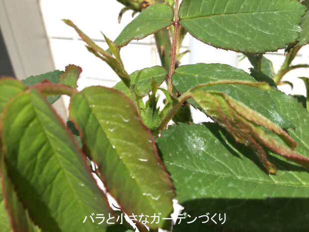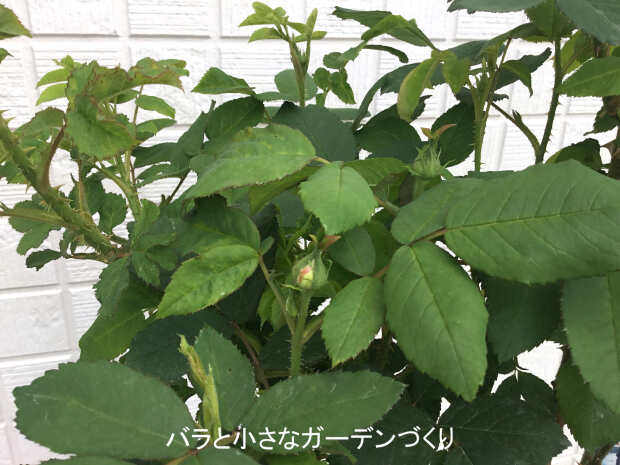 はやばやと蕾も形成されています。葉が少し白くみえるのは、薬剤散布後に撮影したためです。