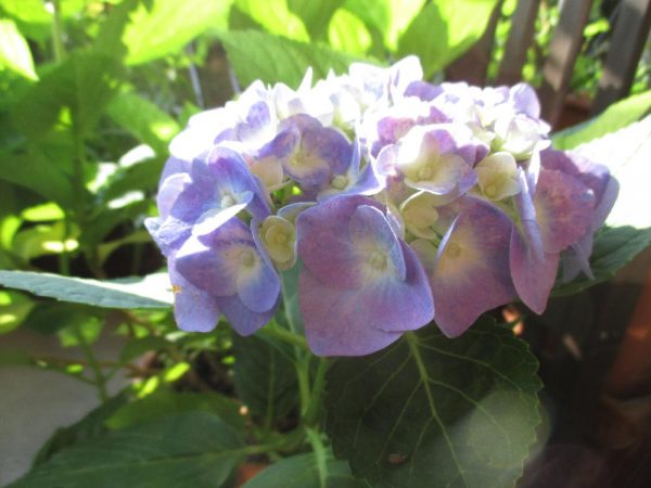 これは我が家のベランダに咲き始めたアジサイです。じつはこれ、もとはきれいな水色でした。去年、一回り大きな鉢に植え替えたのですが、そのときに使った土が中性~弱アルカリ性に寄っていたようです。ピンク色が混じり、なんだか紫色を帯びてしまいました。