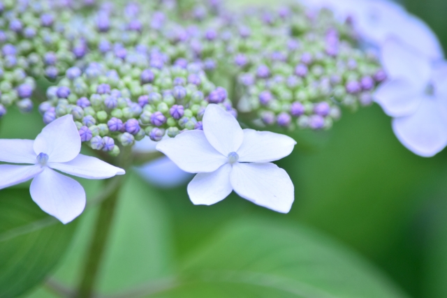重咲きのシンプルな花が、額縁のように周りにだけ咲くのがガクアジサイです。漢字で書けば「額紫陽花」と書きます。咲き方を次に紹介する「てまり咲き」のアジサイと区別して「額咲き」と表現することもあります。