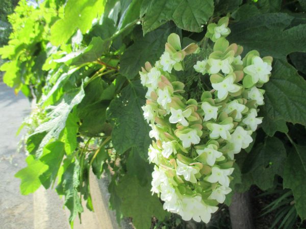 上の写真のアジサイは、カシワバアジサイの園芸品種です。カシワバアジサイは北アメリカ原産で、葉っぱの形が柏の葉のように大きく切れ込みの入った形をしています。秋には赤やオレンジ色に紅葉します。