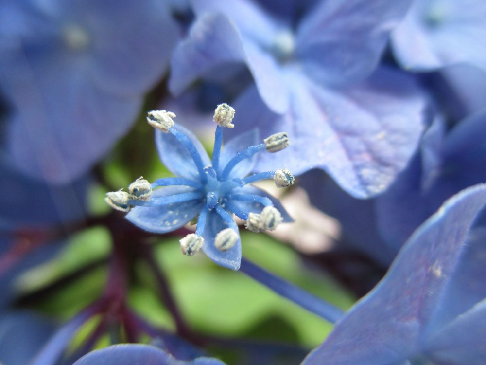 この粒のような花は咲かないことも多いのですが、装飾花をかき分けてみると、本当の花が咲いているのが見つけられます。これはちゃんと雄しべも雌しべもあり、実をつけることができる花です。「真花」と呼ばれます。真実の花って意味あいでしょうね。