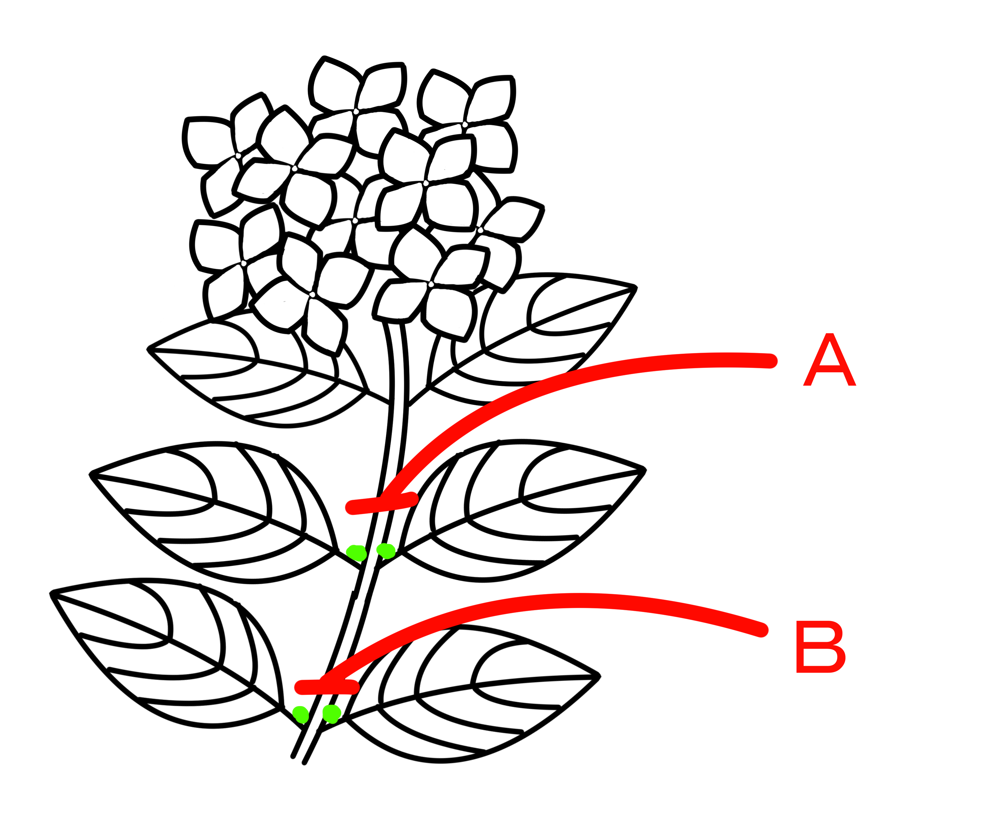 後のアジサイの剪定の基本は、花の下Aの位置かBの位置で切ります。その後8~9月頃、葉の付け根に来年の花芽(緑色の点)ができます。