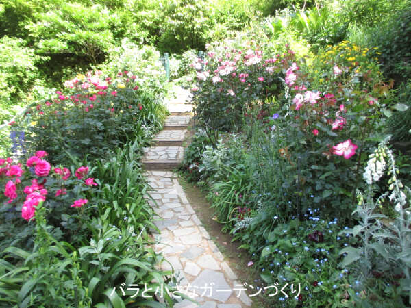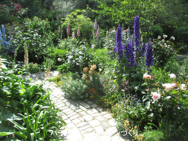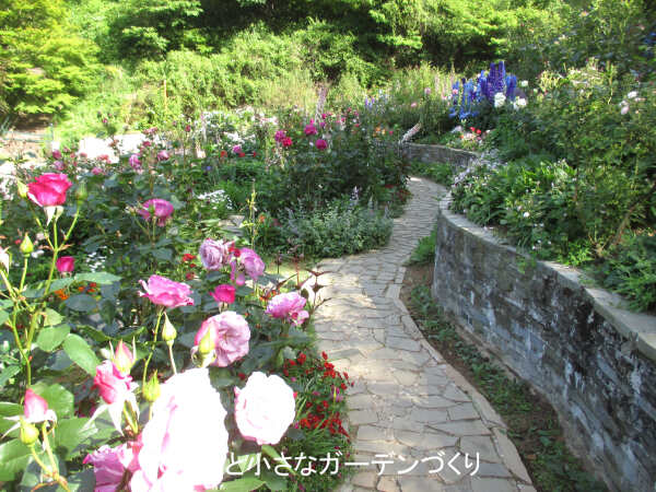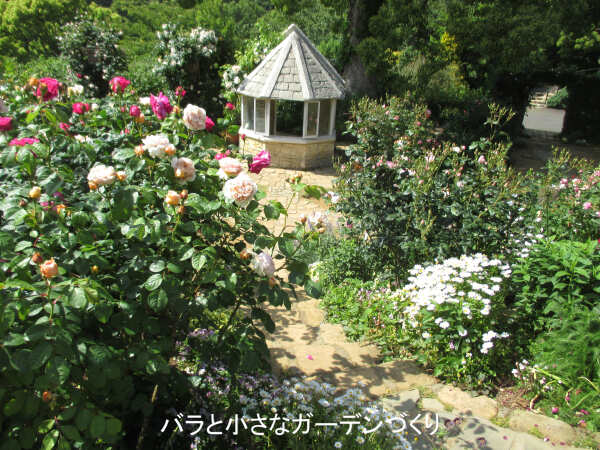 ここにはフランスのナーセリーで作出された、香りの良いバラが集められています。しっかりした石垣や石だたみの小径を通して、イングリッシュローズガーデンよりも人の手が入った印象になっています。さらに、全体に花の色を鮮やかにすることで差別化しているように感じました。