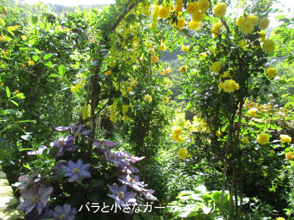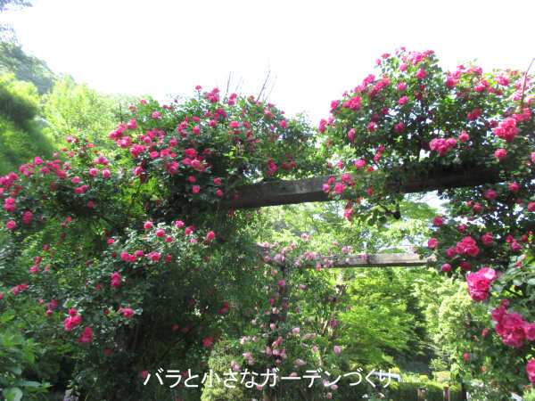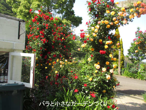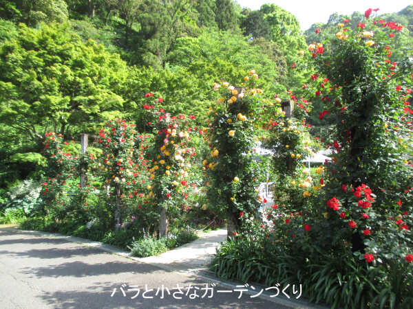 フランスの香りのバラの庭からバス道沿いに少し戻ると、こぢんまりとした「クライミングローズガーデン」があります。たくさんのアーチにつるバラを絡ませた、とても美しいローズガーデンです。少し外れた場所にあるので、ほとんど人がいない穴場のようなスポットでした。