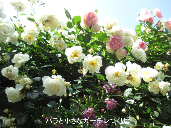 ▲満開のつるバラを重ねてゴージャスに!