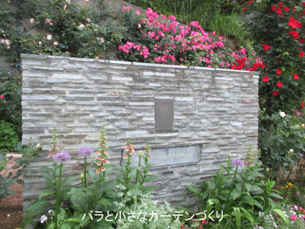 無料駐車場から狭い階段を上ったところに入園口があり、チケット売り場で入園料を支払います。チケット売り場の右手には、世界バラ界連合から授与された「優秀庭園賞」の記念プレートが花に囲まれて建っていました。