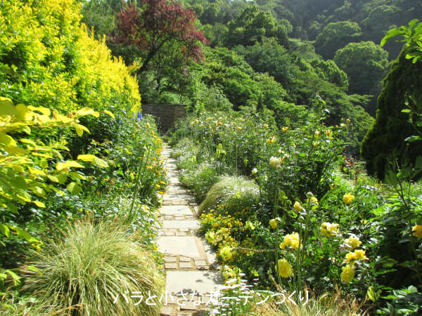 イングリッシュローズガーデンに続く黄色を主役にした「黄金のバラの庭」も素敵でした。目の覚めるような黄色が美しい黄金マサキなどの樹木を生かしたガーデンで、やはり黄色が美しいバラが植えられていました。