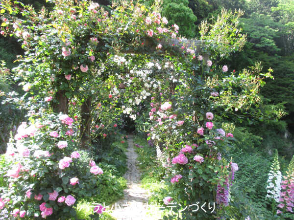 ▲バラと宿根草を混植した「イングリッシュローズガーデン」入口