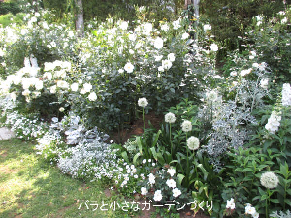 プロポーズガーデンの次は「ウエディングガーデン」。こちらはウエディングドレスを思わせるホワイトガーデンになっています。さまざまな白花や白い葉を重ねて清楚な印象。