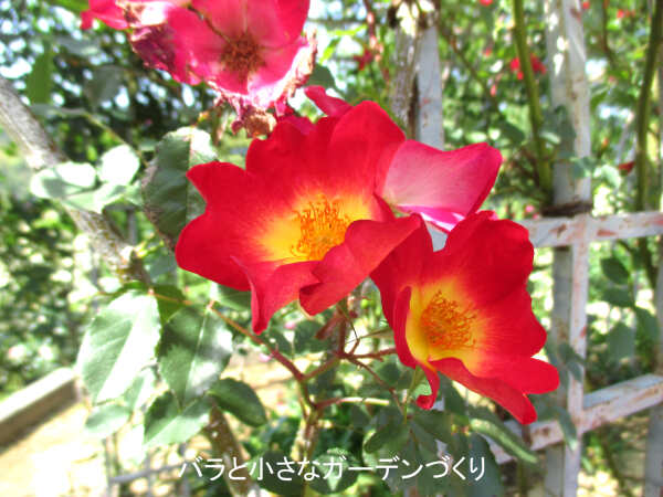 「コレクションガーデン」の下には「カクテル」と「ドルトムント」の赤バラのトンネルがあります。どちらも一重の赤バラで花つきの良い育てやすい人気品種です。