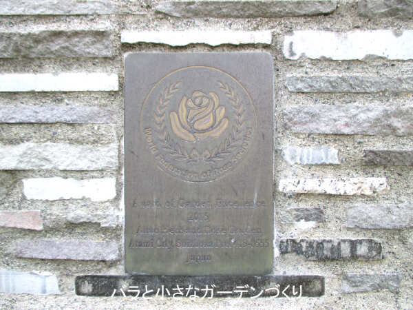 入園口のあたりにある記念プレートには、しっかり世界バラ会連合のエンブレムが刻まれています。