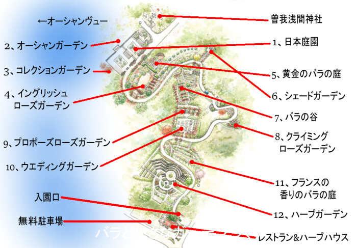 ▲園内見取り図に文字情報を追記 イラスト出展/アカオハーブ&ローズガーデン公式