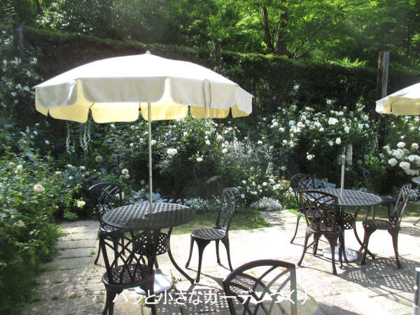 「ウエディングガーデン」には、パラソルつきのテーブルとイスが設置されたオープンカフェがあります。歩き疲れる頃なので、休憩をとるにはぴったりな場所です。