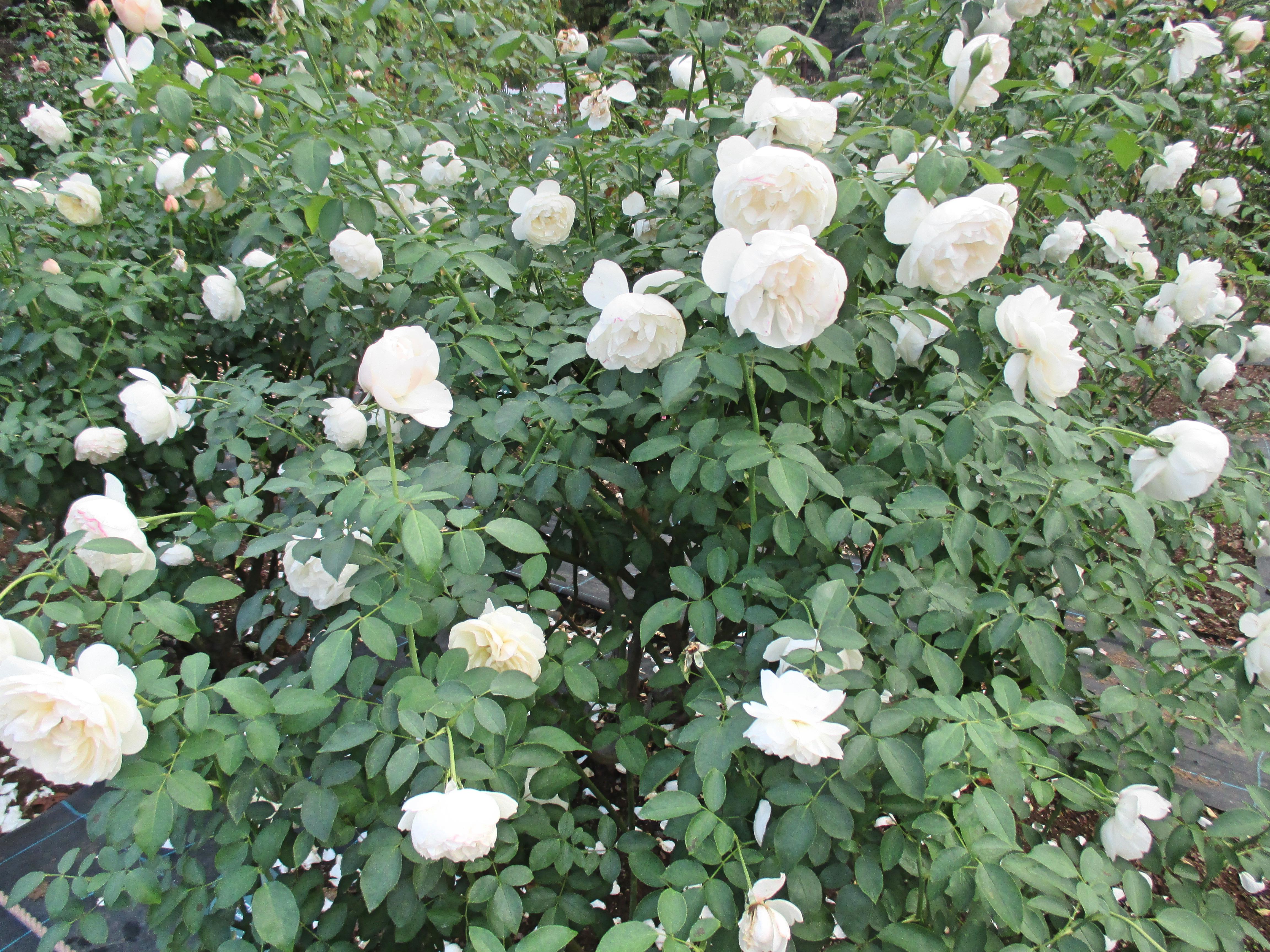 イングリッシュ・ローズは、ほとんどの品種がシュラブ樹形です。自然樹形に育てているイングリッシュ・ローズは、秋花もかなりたくさん咲いていました。写真のイングリッシュ・ローズ「リッチ・フィールド・エンジェル」は、秋バラでもこんなにたくさん咲いていました。日照条件の良い場所で、株も充実しているとはいえ、秋にこれだけ咲いてくれれば嬉しいですね!