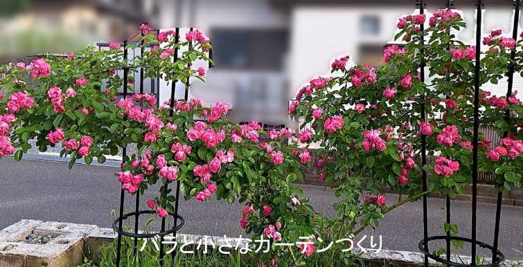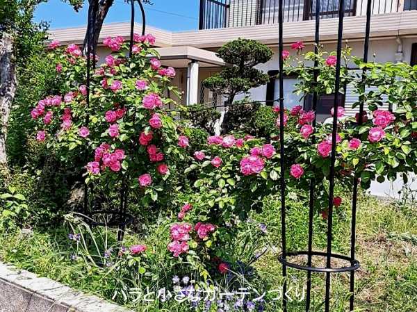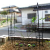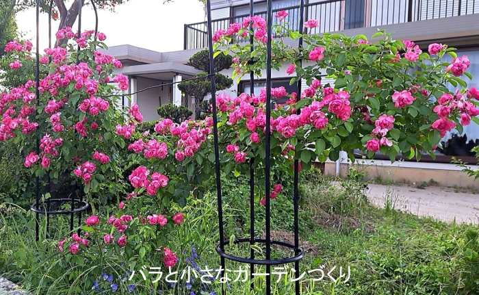 信州の庭はフェンスが取り払われていたので、2つのオベリスクを立てて誘引し、足元に青と白の2色のビオラを植えました。作業は、穴掘りが思いのほか大変でしたね!