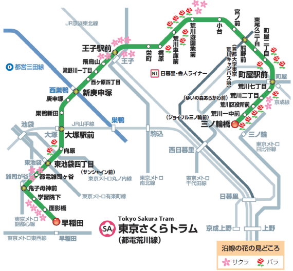 ▲荒川線沿線の花のみどころ 出展/東京都交通局
