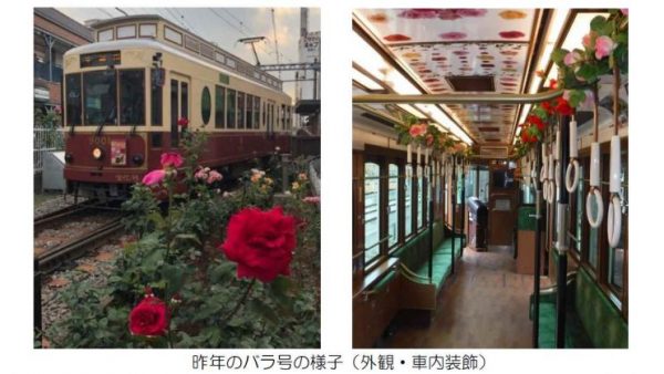 5月の開花シーズンに合わせて車内をバラで装飾したレトロな「都電バラ号」が走ります。運行時期は、例年5月初旬から5月いっぱいまで。レトロなバラ号に乗って窓外のバラを楽しむのも素敵ですね。