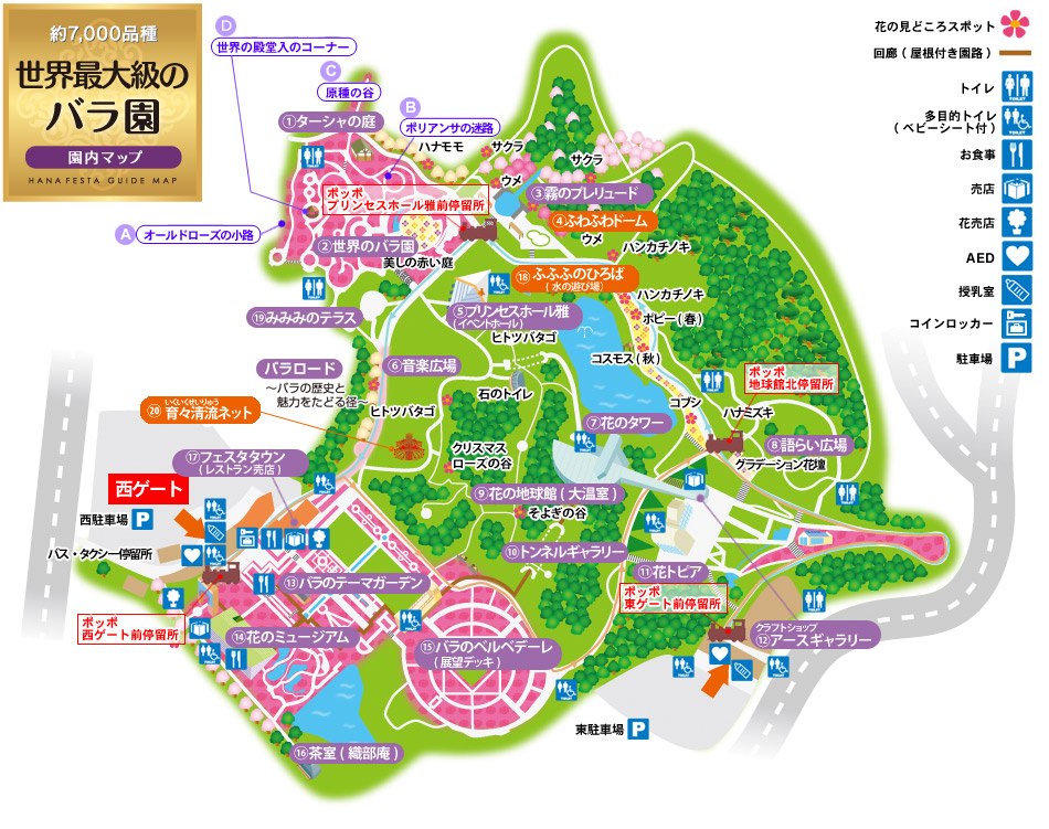 園内図上方には、「世界のバラ園」があり、日本、フランス、イギリスなどの世界じゅうの原種バラ、オールド・ローズ、モダン・ローズと、多彩な品種が集められています。