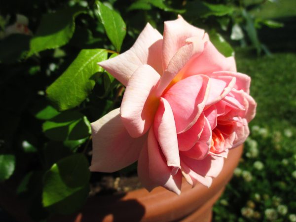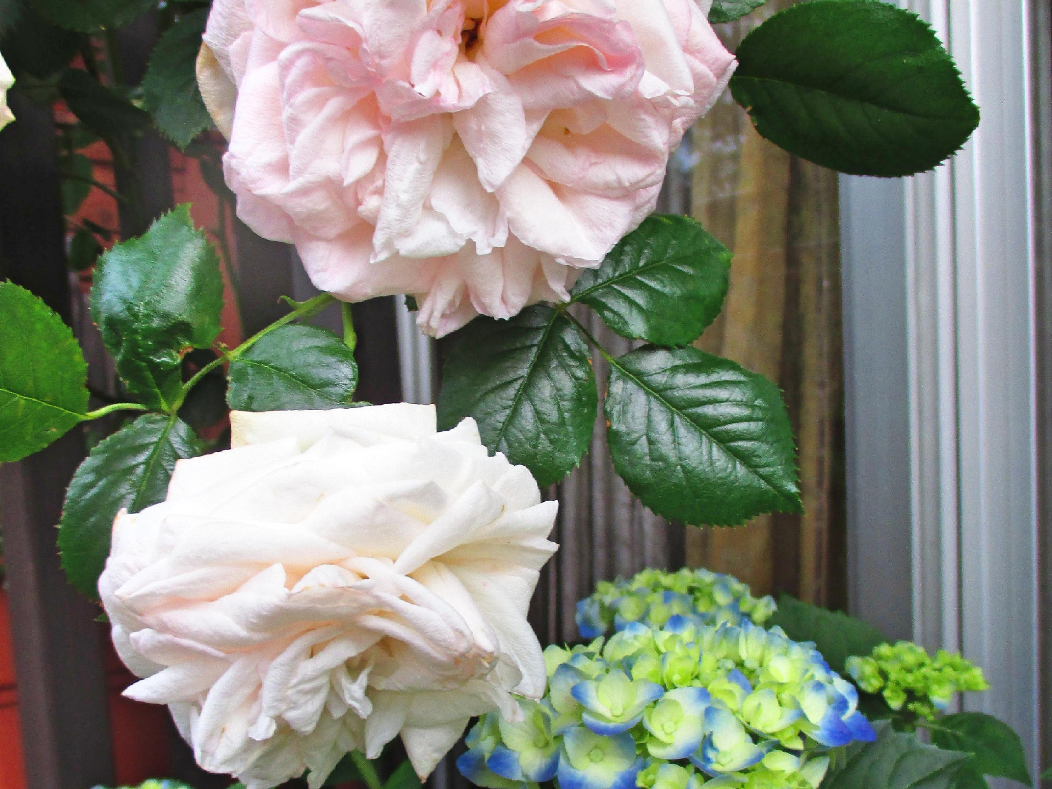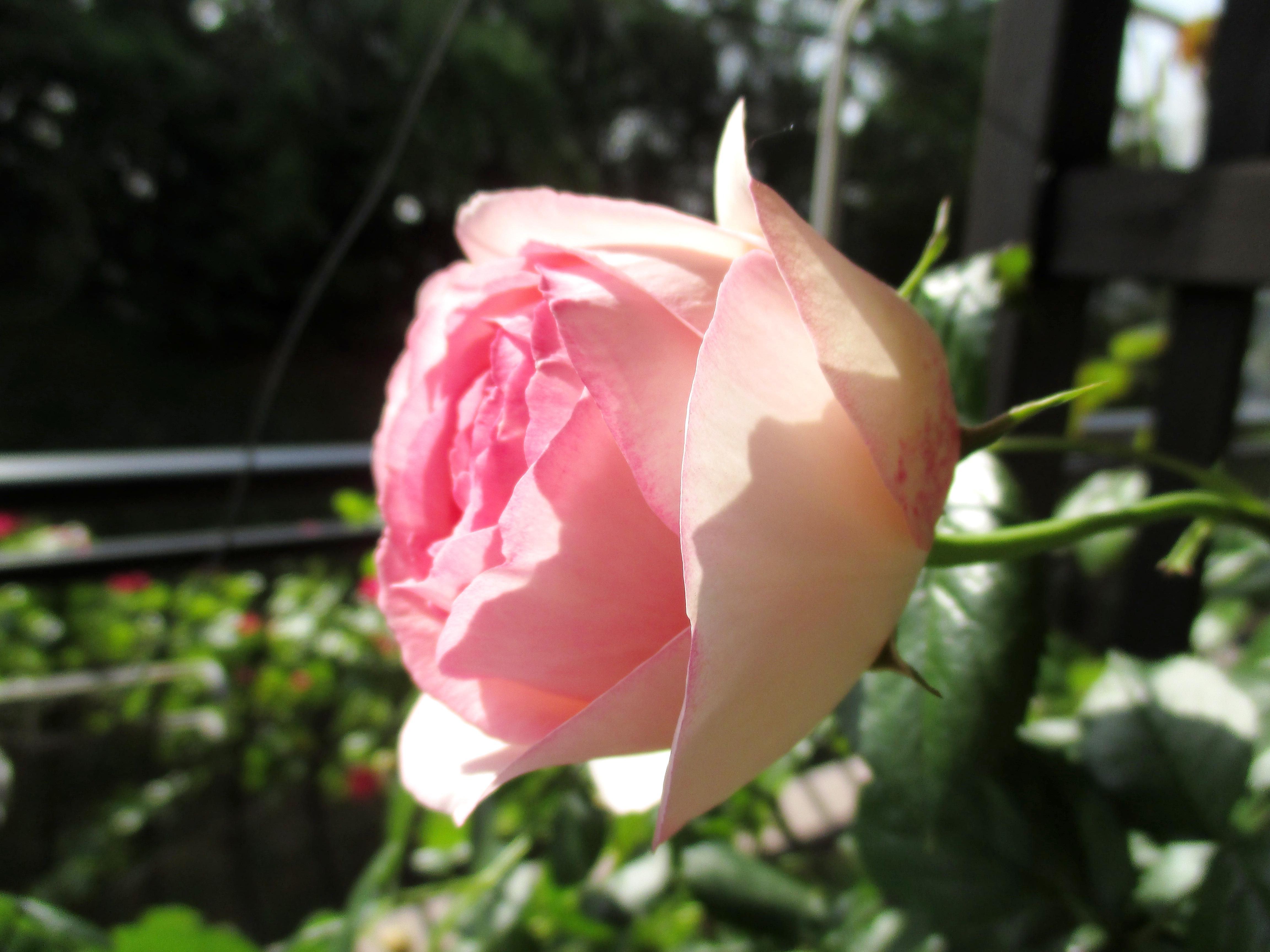 状態の良い花を見つけたら、今度は背景に気を配ってください。このバラは咲きすぎたピエール・ドゥ・ロンサールです。花の状態も良くない上に、さらに背景が悪いですね。アルミの窓枠がはっきり写っていて、いかにもスナップ写真という出来上がりです。いい写真からは程遠いです。
