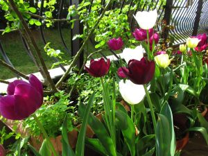 白と紫しかなさそうに見えるけれど、これでも6種類のチューリップが咲いているんですよ!