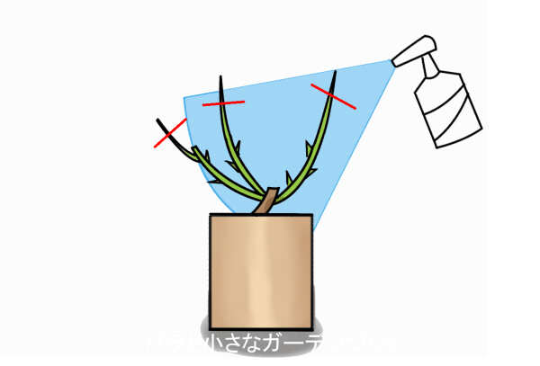 に枝先を軽く切り戻し、全体にたっぷり殺菌剤を散布します。枝にも病原菌が付着しているので、洗い流す要領でたっぷりと。ここでの殺菌剤は、できれば予防に使うものではなく、治療薬のサプロール乳剤やラリー乳剤の方が望ましいです。