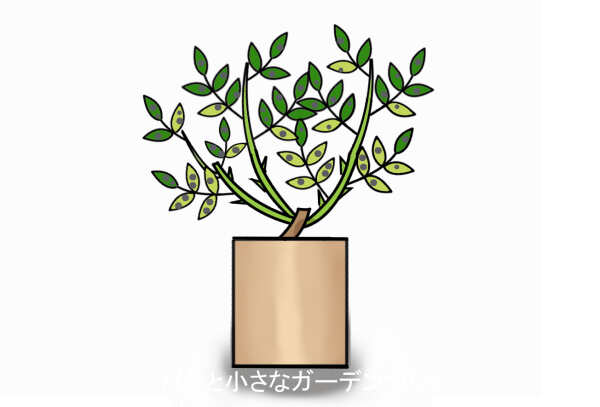 とんどの葉が落ちて枝だけになってしまった場合。もしくは上の図のように、まだ葉はあるけれど、株全体に黒星病が蔓延してしまった場合の対処法です。