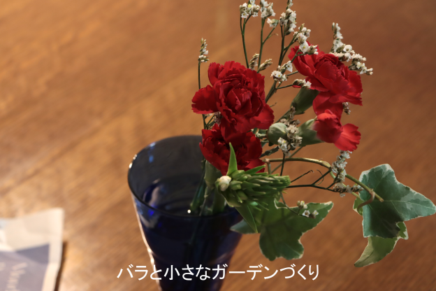 茎の長さは23~25cm。茎の先を輪ゴムで止め、小さなビニール袋に水を入れて差してありました。ビニール袋と輪ゴムを外し、茎の根元を水につけ、水の中でナナメに切ってから青いビアグラスに。最初からバランスよく組み合わせてあるので、特別なことをしなくてもサマになります。