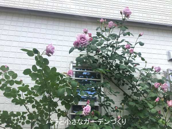 木立ち樹形にもどってしまった「つるブルームーン」を3年かけて350cmまで伸ばし、満を持して家の北側の壁面に誘引した「つるブルームーン」。木立ち樹形の「ブルームーン」も育てており、以前から好きな品種でしたが、家の壁に誘引してその良さがさらに引き立ちました。