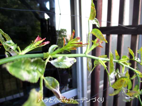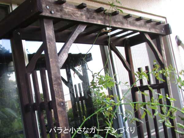 これは我が家のベランダに設置したバルコニー用小型アーチです。アーチの間にワイヤーを張り、枝が柔らかいタイプのつるバラ「紅玉」を誘引しています。