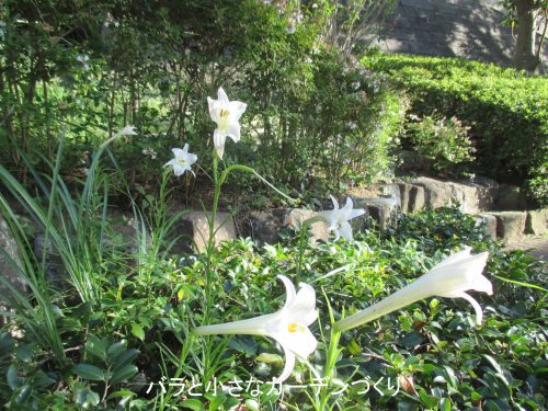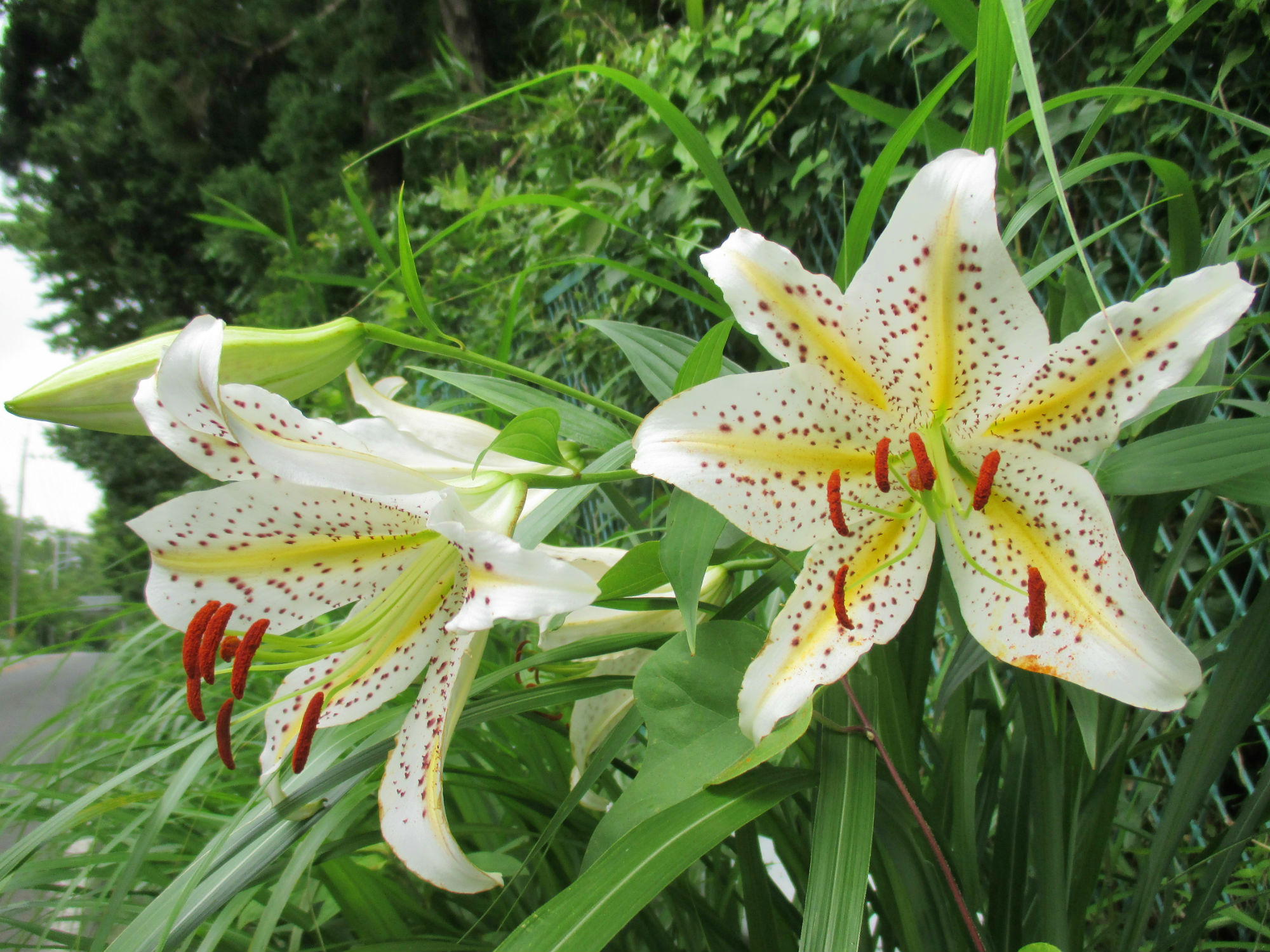 今、タカサゴユリとその交雑品種の開花時期で、あちこちで白い花が揺れているのを見かけます。