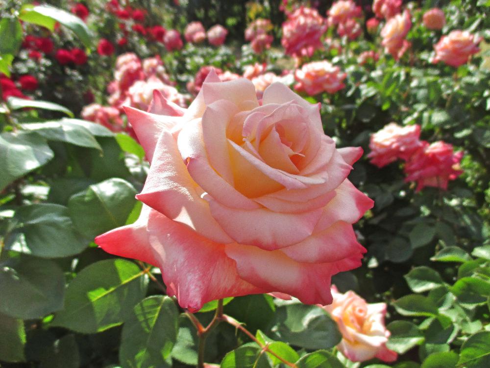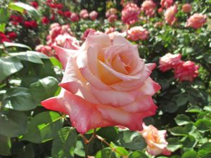 今は亡きダイアナ妃の名を冠したバラ。大輪で開花が進むにつれてアプリコットピンクが濃さを増していく。淡いピンクが乗りはじめた開花直後の頃が一番美しい。