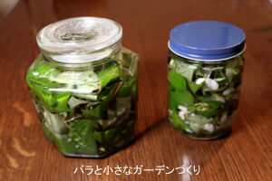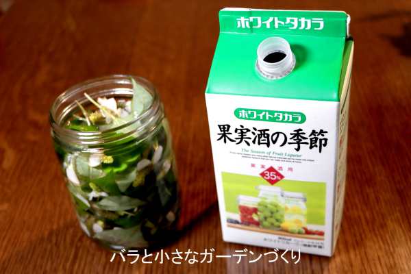 花を入れた方は甘い香りに、葉だけの方はやや青臭い香りに仕上がります。薬効と香りを考えると、花と葉を一緒に浸けた方がいいように思います。