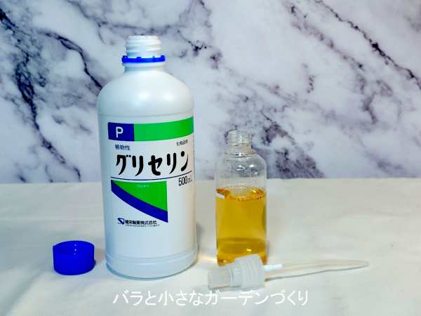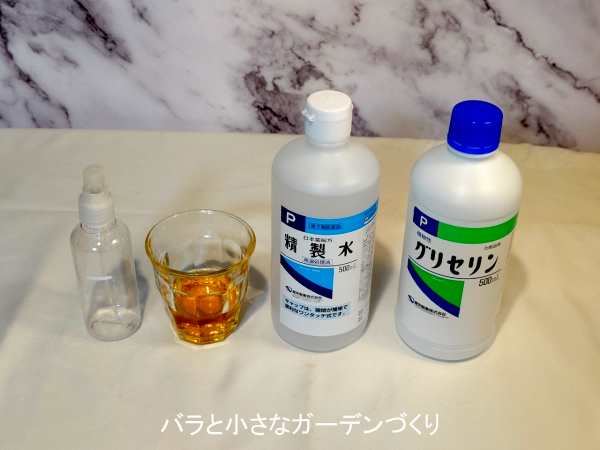今回は50mℓ分を作るので、スプレーボトルの50mℓのところに白いシールで目印をつけています。精製水は薬局で500mℓ100円ていど。グリセリンは保湿成分で、薬局で500mℓ1000円ていどで購入できます。