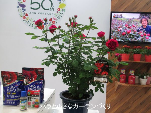 たとえばマイローズシリーズのバラに使える農薬や肥料などを販売している住友化学園芸のブースでは、バラの家の木村卓功さんがミニ講演をしていました。残念ながら聞き逃してしまったのですが、おそらく農薬などの上手な利用方法なんかを教えてくださっていたのでしょうね。