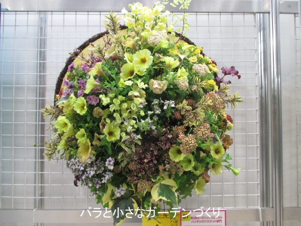 ハンギングバスケット部門の金賞受賞作品は「秘密の花園」。淡い黄色の花を主役に、ライムイエローの斑入り葉や紫の小花を組み合わせて、シックにまとめられています。コメントには「緑に囲まれて、ゆっくり流れる時を過ごせますようにと、作成致しました」と、書かれていました。