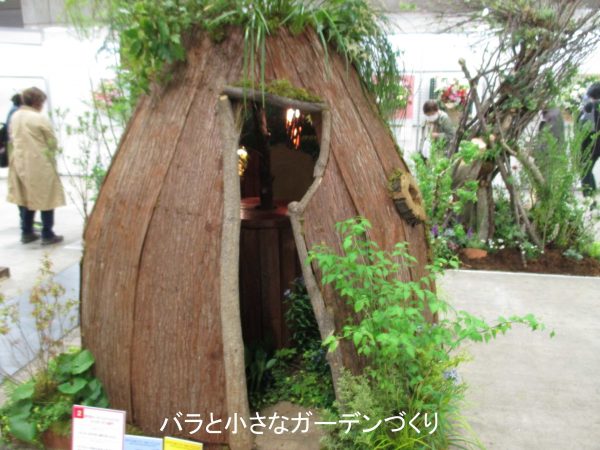 ミニガーデン部門の金賞受賞作品は「もしも、木の中に家があったら」。木の皮を円錐型のテントのように並べ、その中に小さな部屋をつくってあります。コメントに「あり得ない想像を現実で実現。幼い頃の想像を今になって実現します」と書かれてありました。子どもの頃に誰もが憧れた秘密基地のようで、とても楽しいですね!