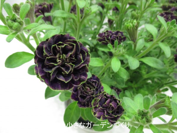 八重咲きの緑色の覆輪をもつ濃い紫色のペチュニアです。花径3cmほどの小輪で、たくさんの花を咲かせます。「ヴァチカーノ」という名前のとおり、なんともヨーロッパの重厚な雰囲気が漂う花ですね。