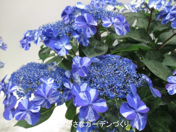 紺色に近い濃い青に白の斑が入った美しいガクアジサイです。写真では明るく写ってしまっていますが、実際はもっと濃い色をしていて、とてもきれいでした。「初夏の青空をイメージした花色です。丈夫で育てやすいです」と書かれていました。今回の展示では、わたしはこれが一番気に入りました!
